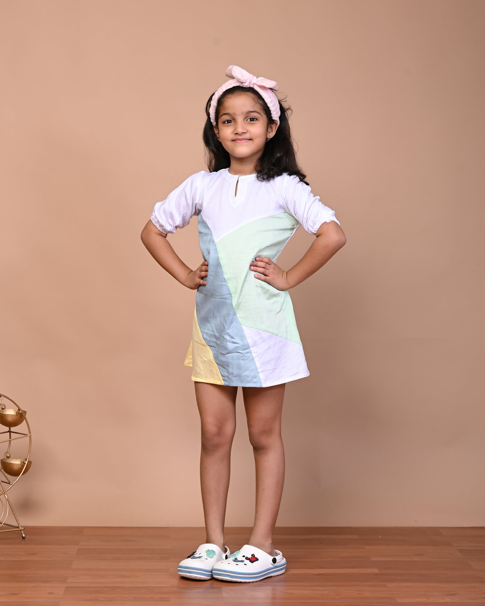 This cotton-rich dress is a sweet choice for sunny days. It's made in a regular fit with puffed elbow sleeves and a round neck. The button fastening at the back makes dressing easy. A multicolor patch style design adds a summery feel.
