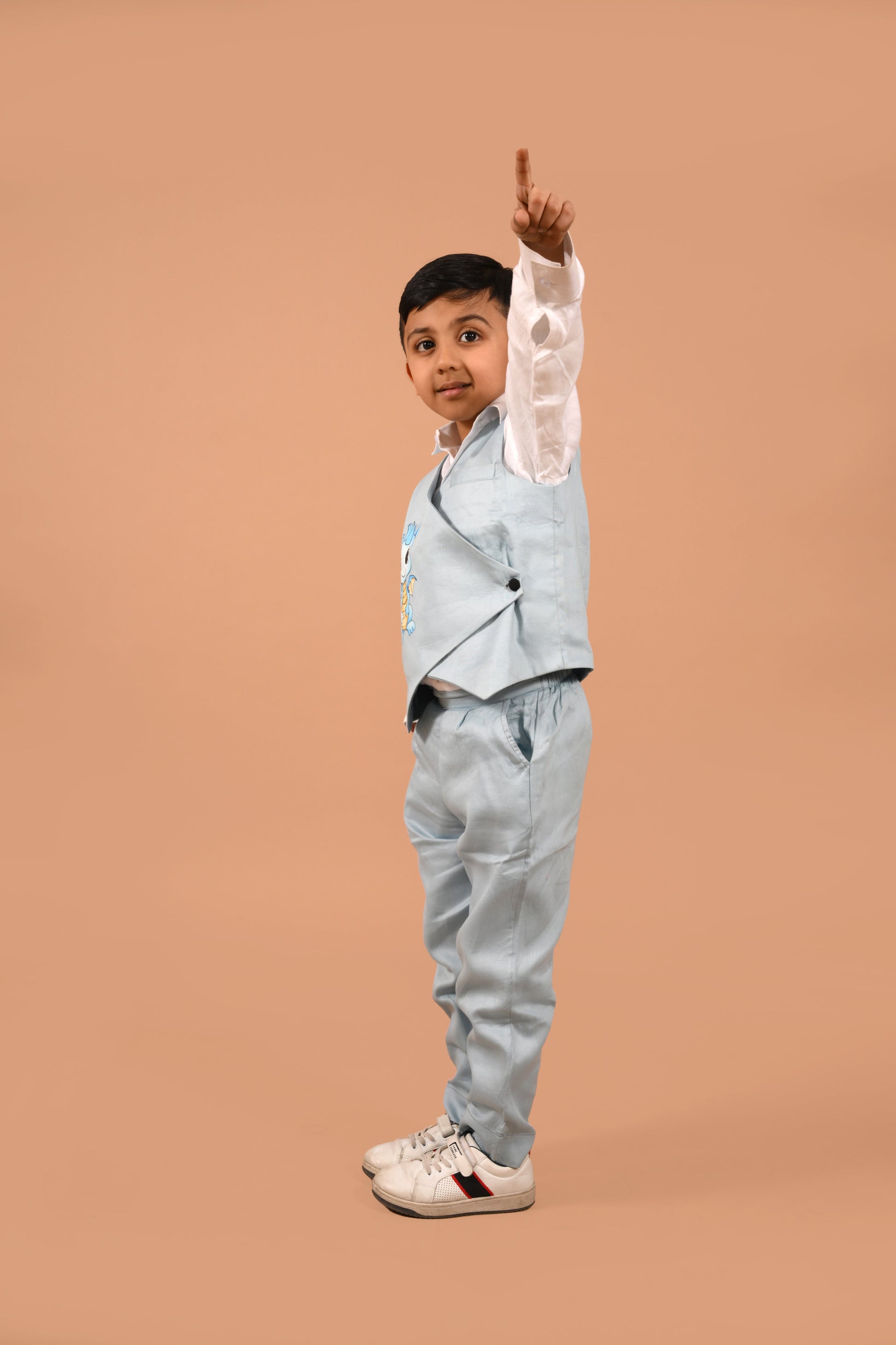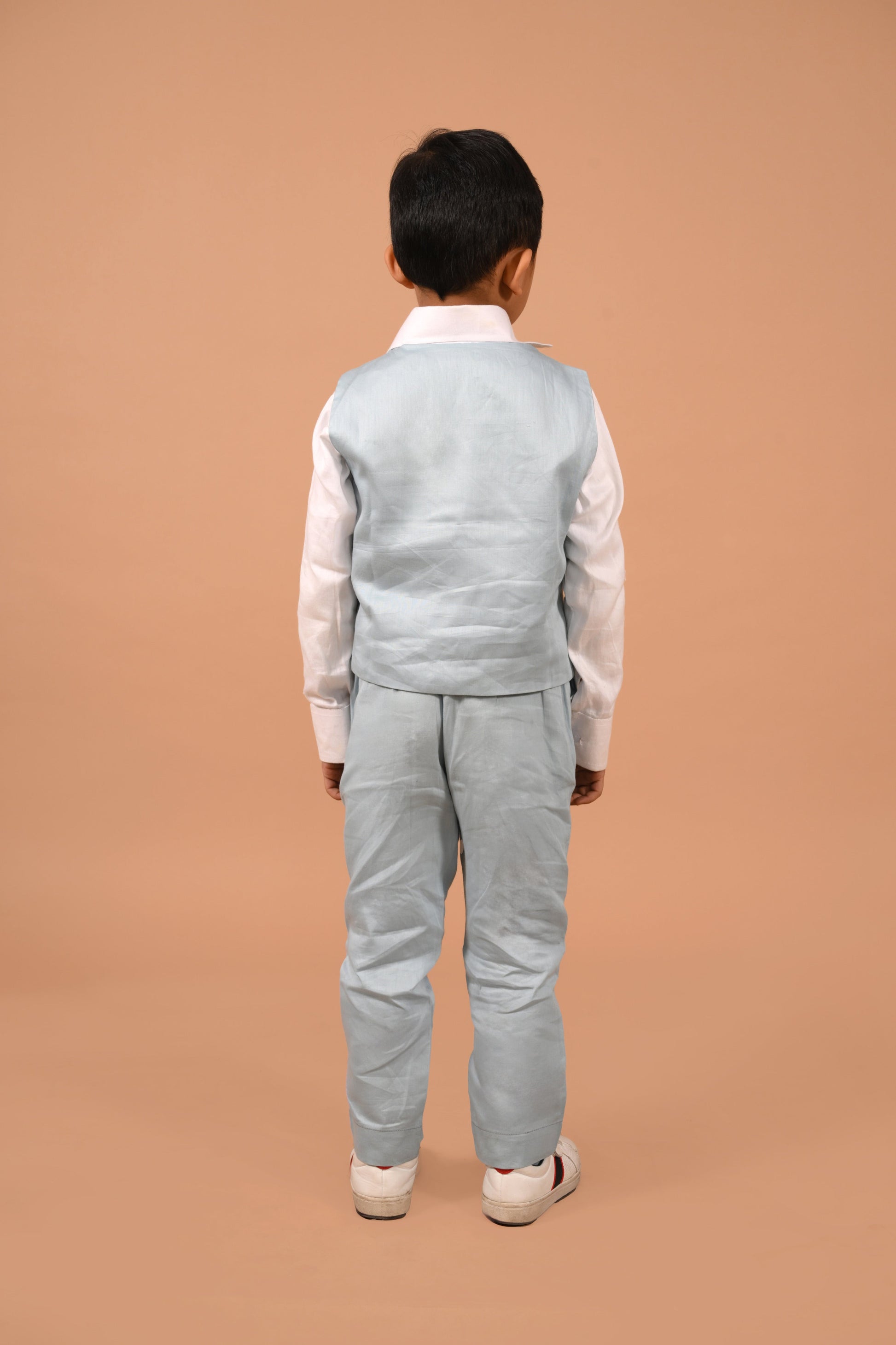 These Handpainted set ensure your little one is the smartest guest at the party. The over lapped waist coat is cut in a regular fit, with a single button fastening . Trouser detail include elasticated waist at back and side slip pockets.