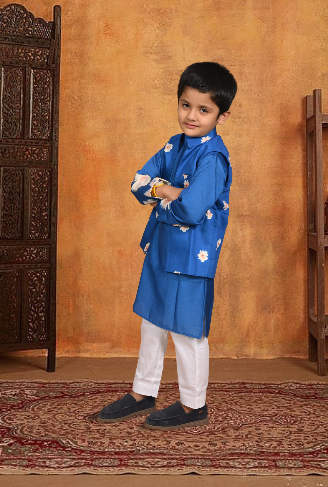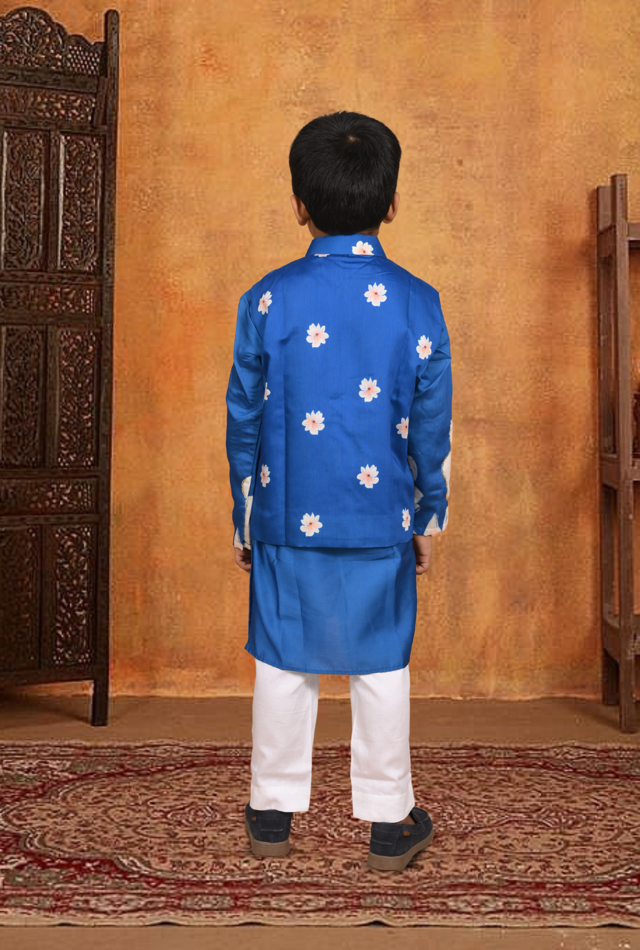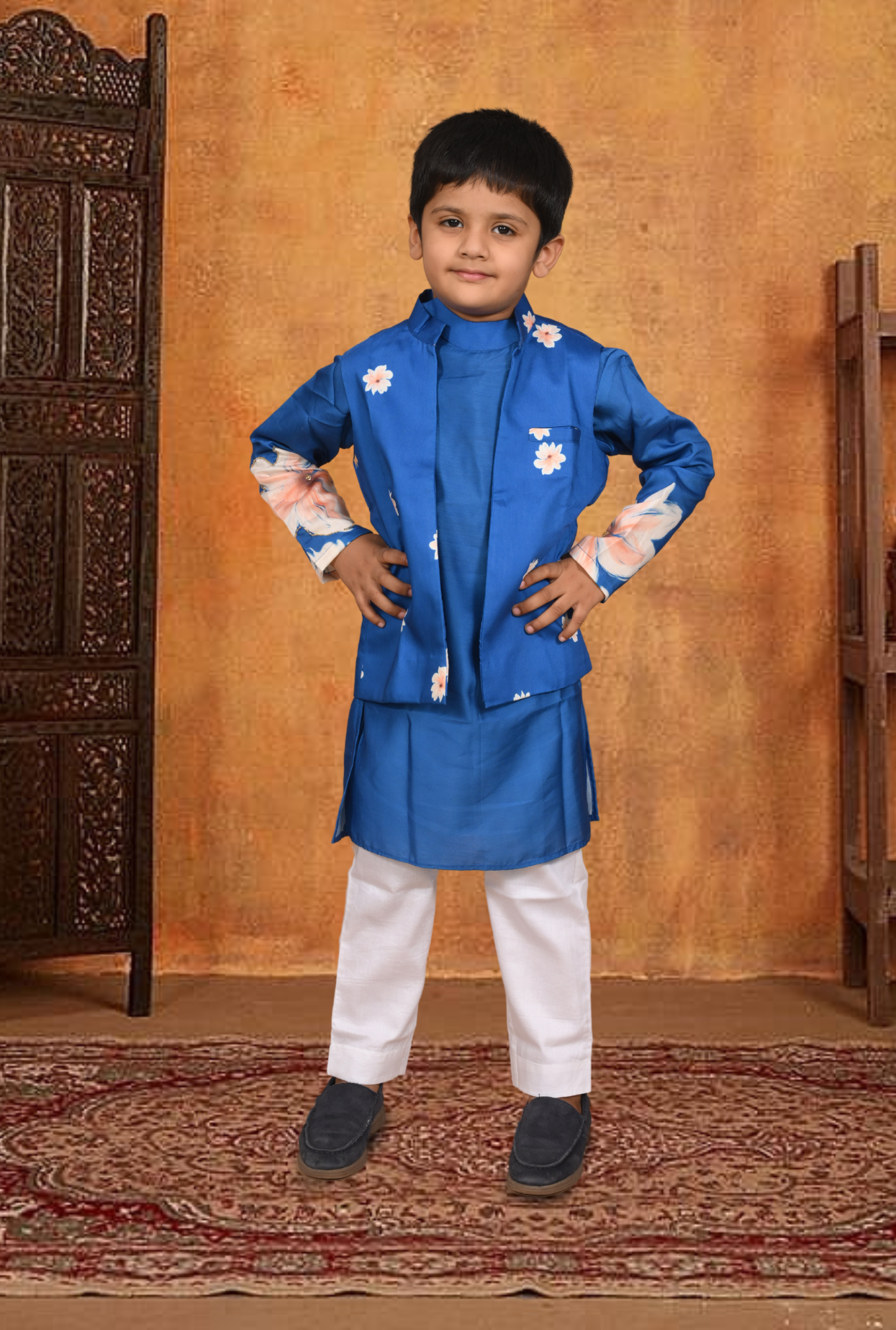 Get your kid ready for the festive ready in this three-piece floral silk outfit. The kurta features Cutdana work embllished floral sleeves, button closure at front and is paired with the white pants with comfy elasticated waist. Adding to it is the open sleeveless jacket with small flower print to make it a stylish addtion to a ethnic wardrobe.