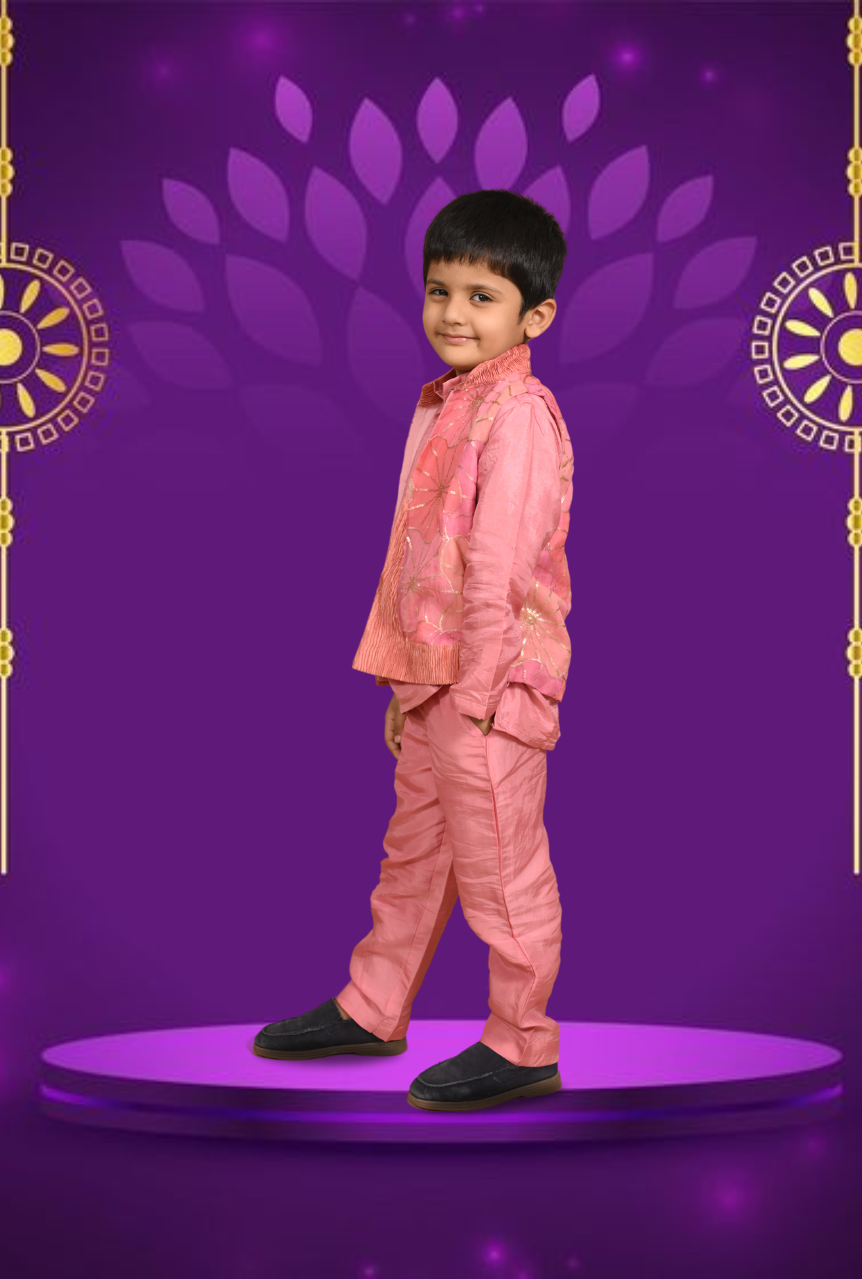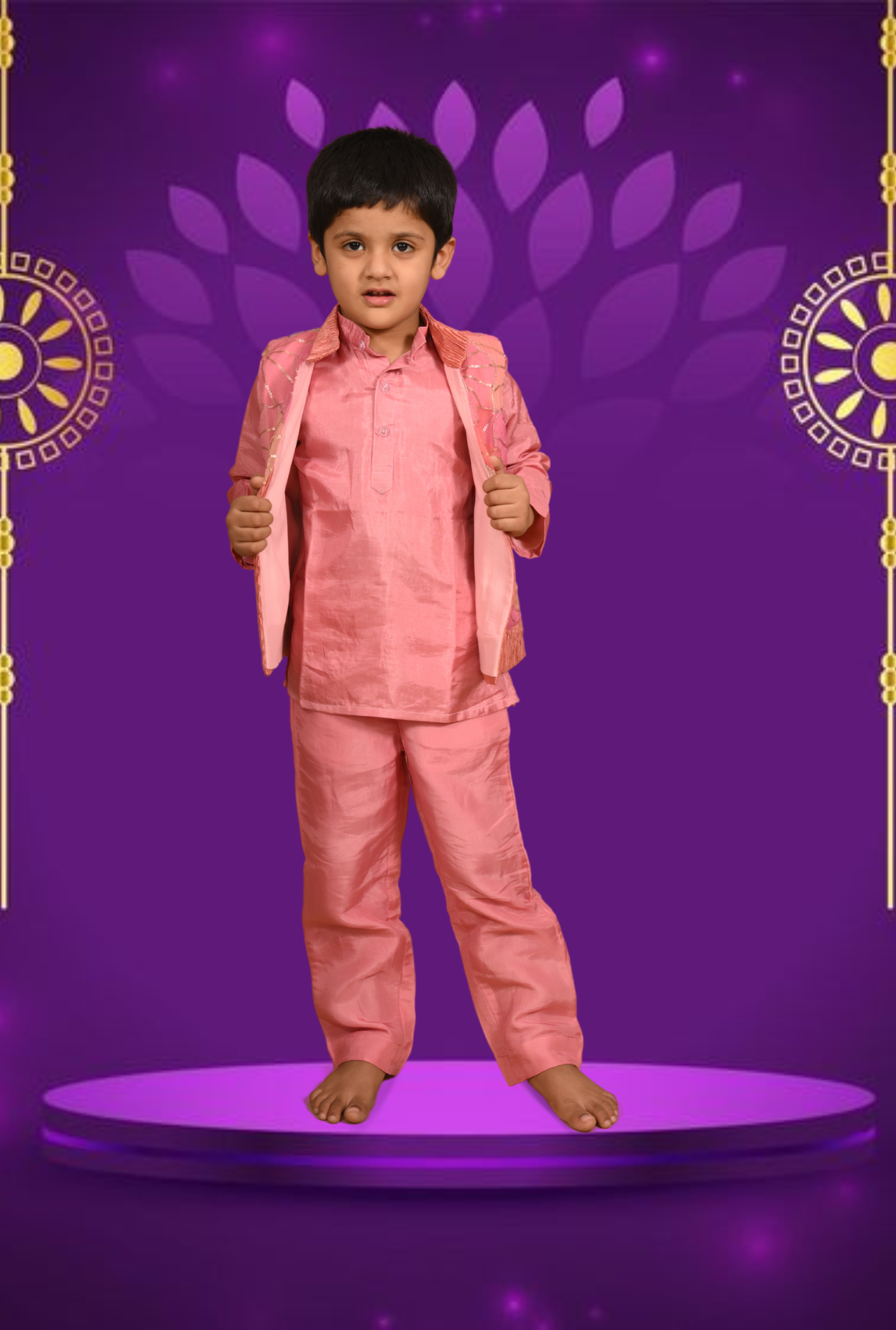 Get your kid ready for the festive ready in this three-piece embroidered organza silk outfit. The short kurta features full sleeves, button closure at front and is paired with straight pants with comfy elasticated waist. Adding to it is a open sleeveless organza jacket,highlighted with abstract sequin embroidery and crushed design at hem and collar.