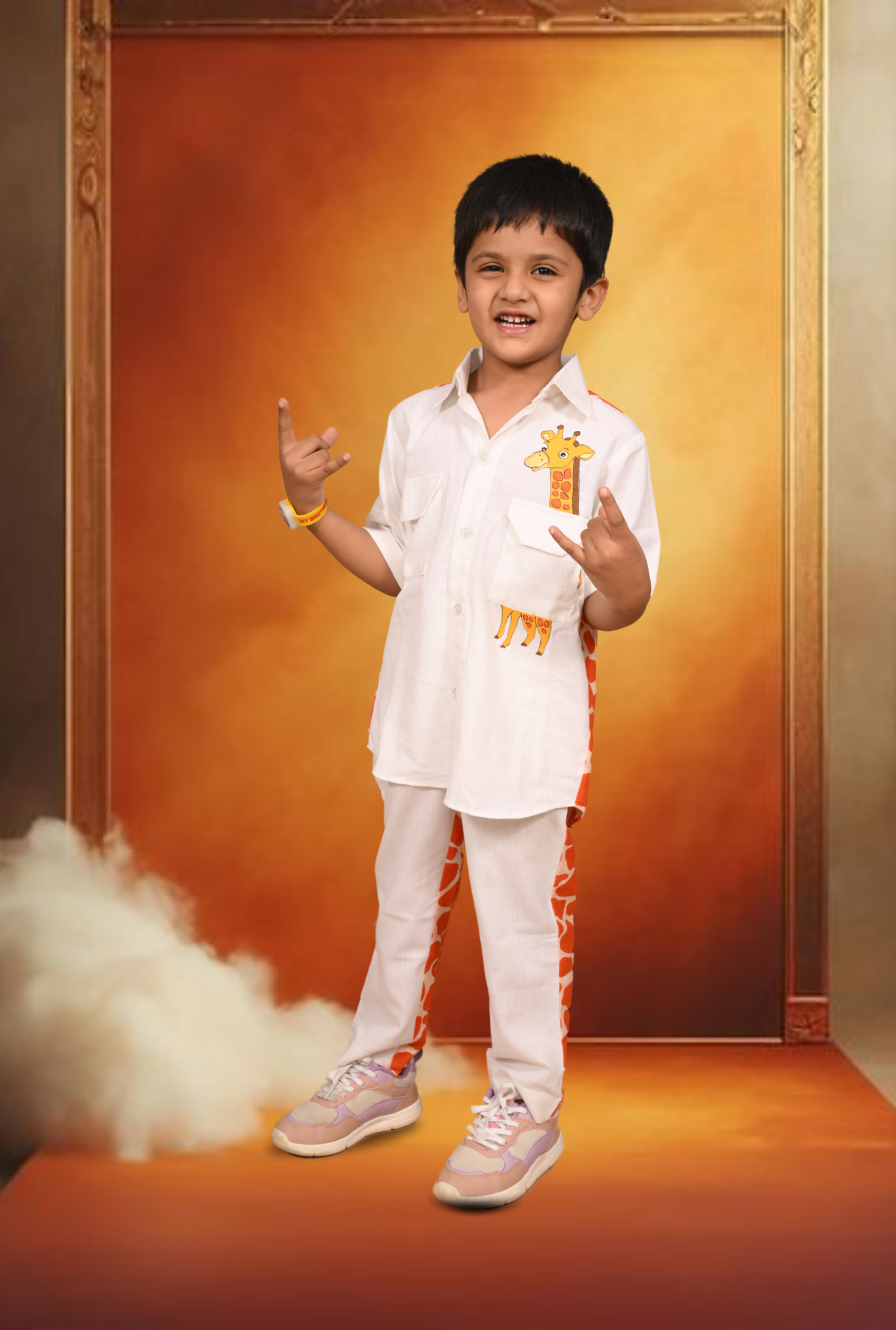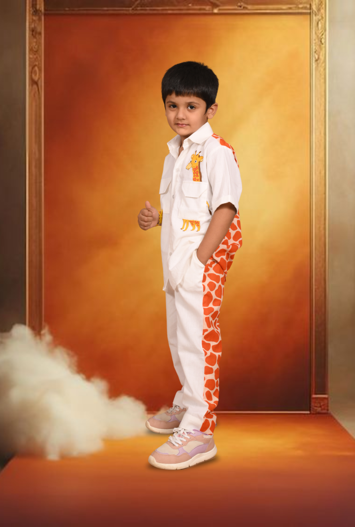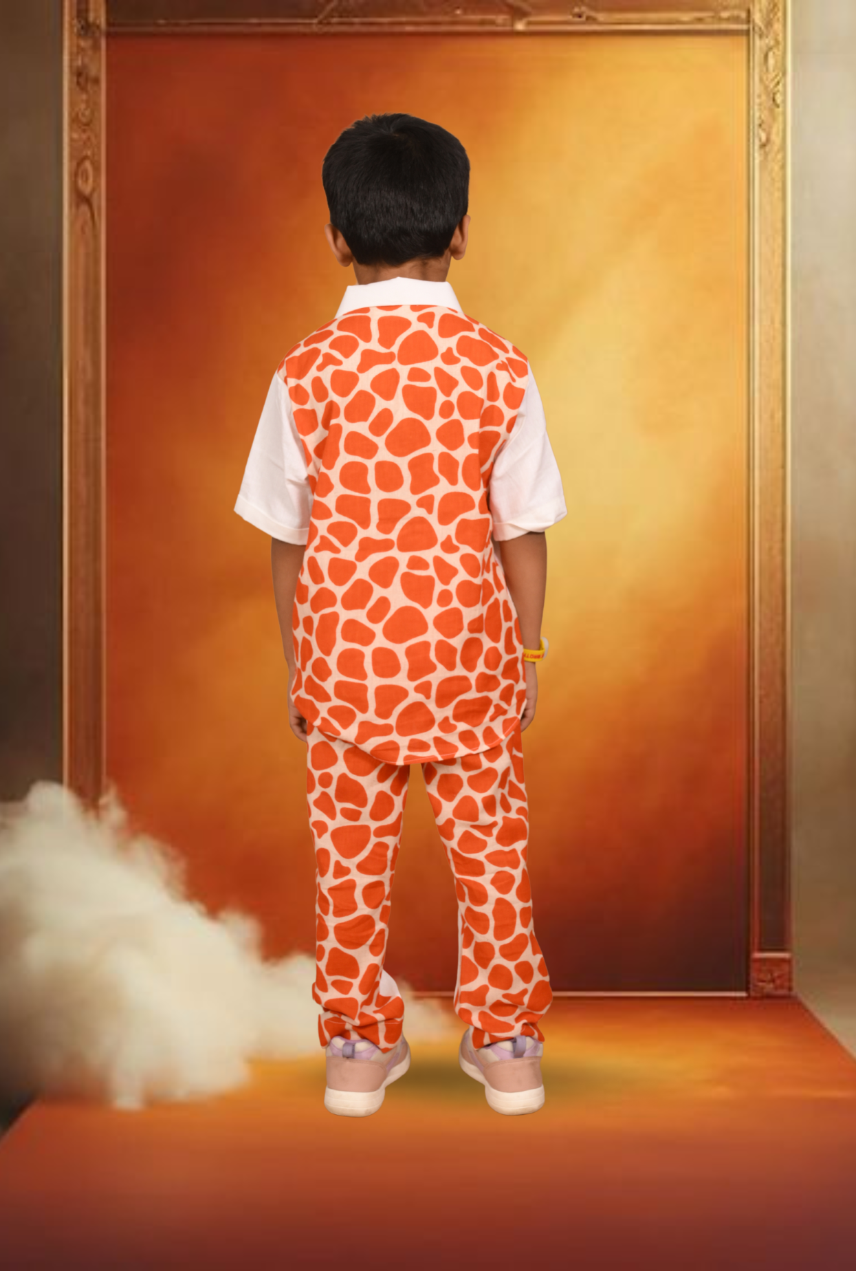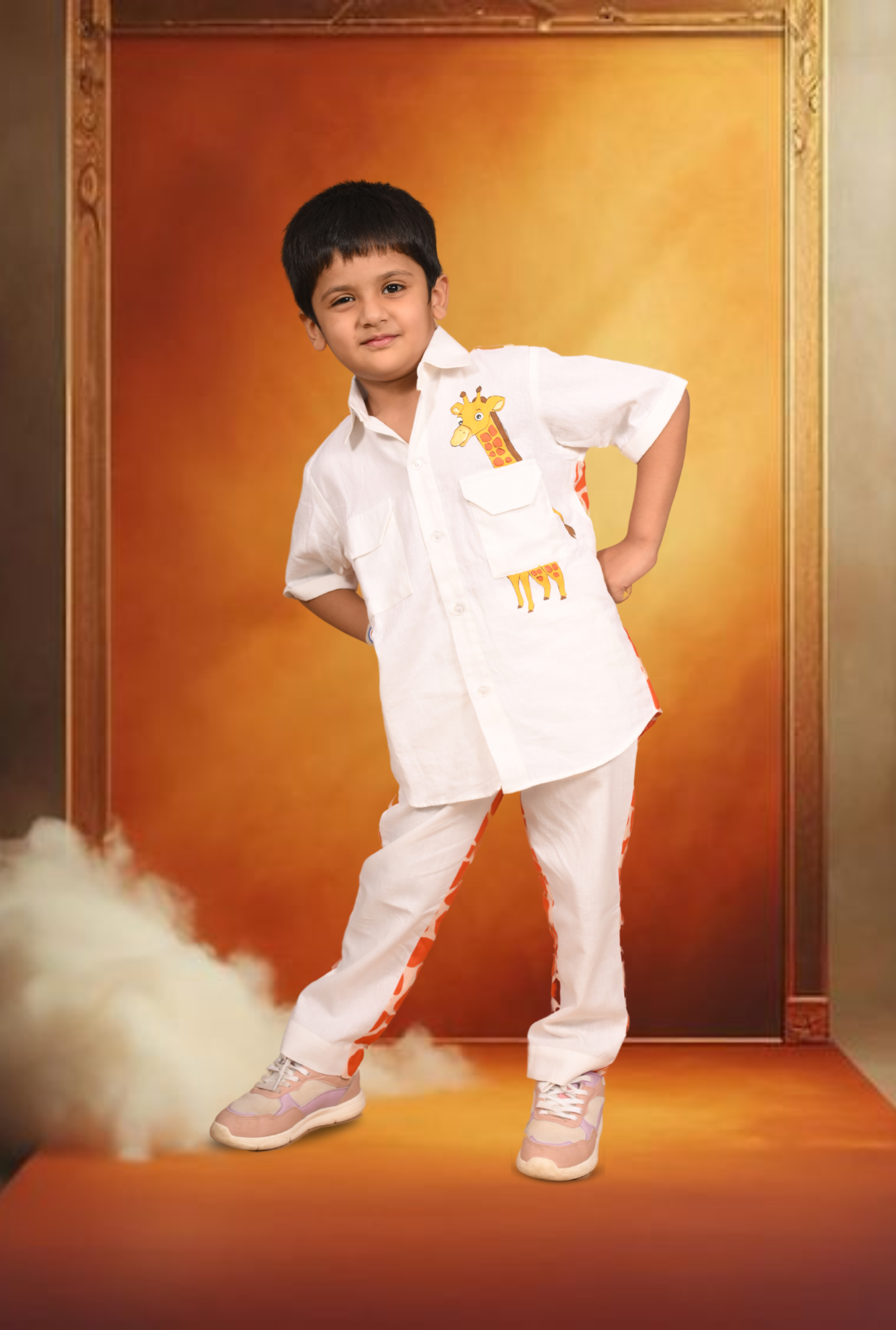 Keep it cool and classy on those weekend days out with this pure cotton shirt and straight pants. Two-piece set, cut to a comfy regular fit.The Giraffe hand painted shirt and pant has plain front and printed back.
