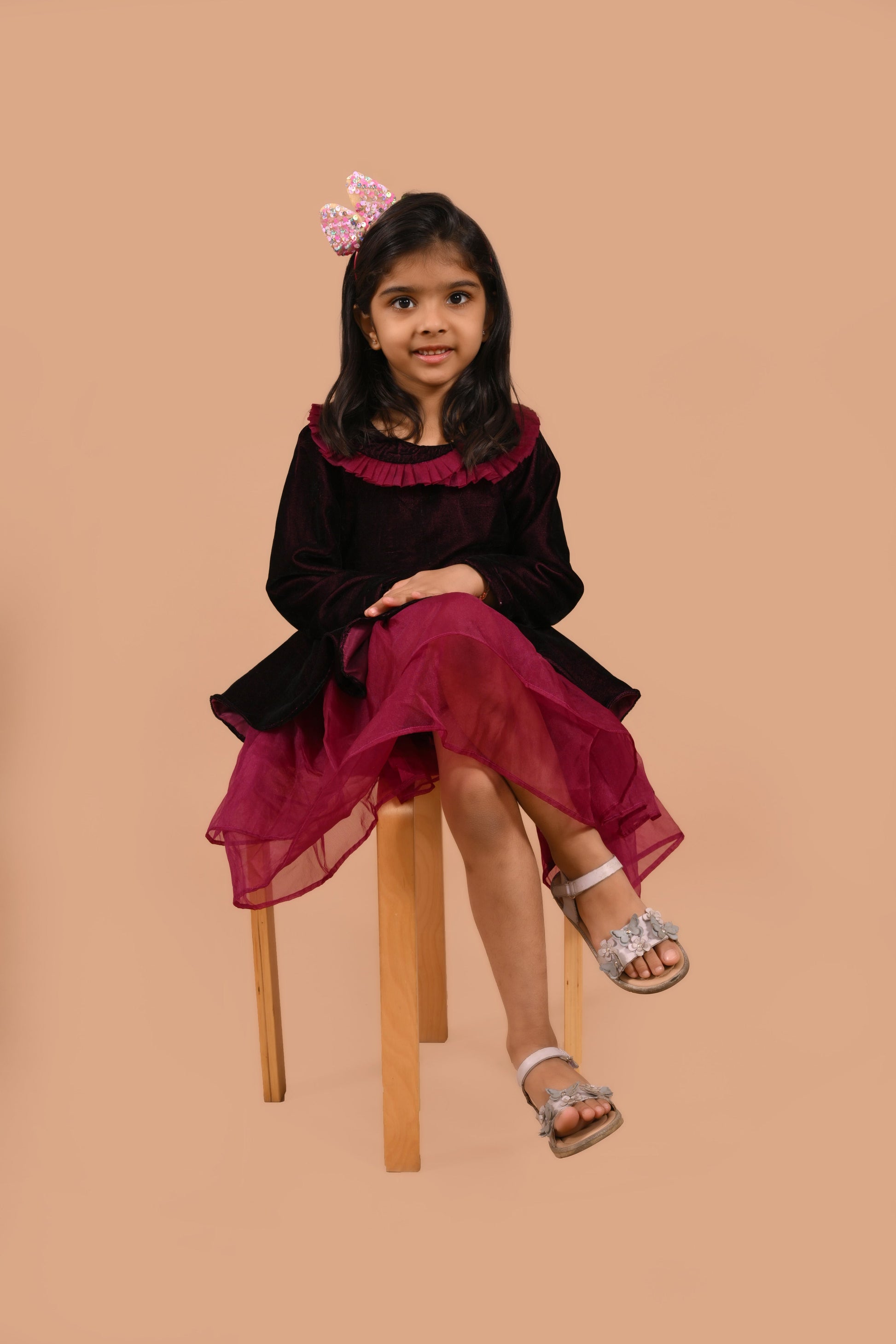 They will feel like a princess in this gorgeous velvet dress. Made in a regular fit with long sleeves, a frilled peter pan collar neck and a button fastening. Full glitter organza frills makes the dress opulent.